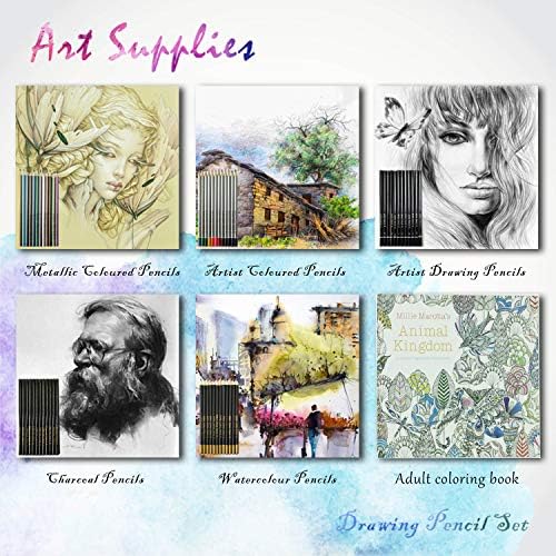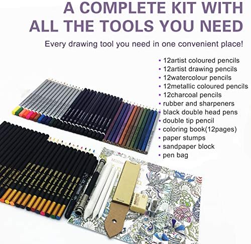 Contains 60 pencils: 12 colouring, 12 watercolour, 12 graphite sketching,12 Metallic Colouring,12 Drawing Pencils Also includes Pencil Knife, Hook Line Pen,eraser, Frosted Board, 3 Paper Blending Stumps,Dual Head Pencil Extender, Zipper Case.