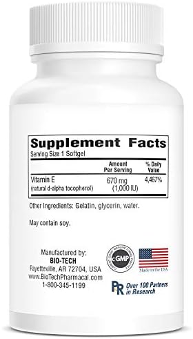 Vitamin E refers to a group of fat-soluble antioxidants that protect cells and tissues by eliminating harmful free radicals.*….As a potent antioxidant, vitamin E may support cardiovascular, immune, and nervous system health.*….Although vitamin E is present in a variety of foods, many individuals do not obtain sufficient amounts from their diet….Vitamin E naturally occurs in eight different forms, but research suggests that vitamin E as d-alpha-tocopherol is the most biologically active.*….This product is manufactured in USA under Good Manufacturing Practice ( GMP ), which ensures high quality, and is supplied with original packaging and labelling.*….These statements have been made by Bio-Tech Pharmacal, Inc. in the USA and have not been evaluated by the Food and Drug Administration…..This product is not intended to diagnose, treat, cure, or prevent any disease.