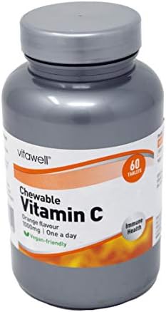 60 Orange Flavour Chewable Vitamin C 1000 mg Food Supplement Tablets With Sweeteners. Direction Of Use: Adults and Children Over 12 Years: Chew One Tablet Daily. DO NOT EXCEED The Daily Intake. Ingredients: Bulking Agent (Sorbitol), Sodium Ascorbate, Ascorbic Acid, Anti-Caking Agent (Silicon Dioxide), Maltodextrin, Magnesium Stearate, Sweeteners (Aspartame*, Acesulfame K), Flavouring, Acacia Gum. *Contains a source of phenylalanine.