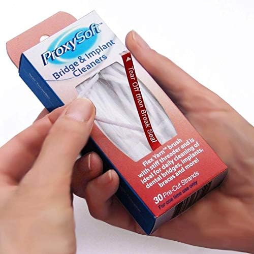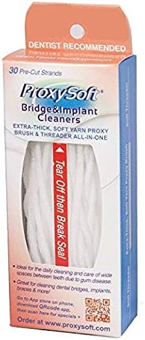 FOR CLEANING DENTAL BRIDGES AND IMPLANTS — This floss is a special-use, interproximal dental cleaner that features an extra-thick brush section to clean around dental implants and under bridgework. This spongy brush section is thicker compared to other yarn proxy brushes, making it a perfect daily cleaning device for care of moderate to severe gum disease.