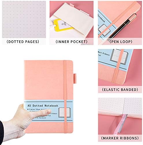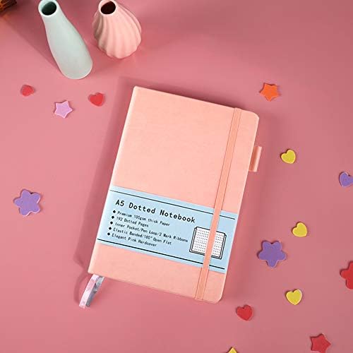 Dotted Notebook A5, Hard Cover Dotted Journal with Premium 100 GSM Thick Paper, Inner Pocket, Elastic Banded, Faux Leather Cover, 192 Pages, 14.5X21.3 cm (Pink)