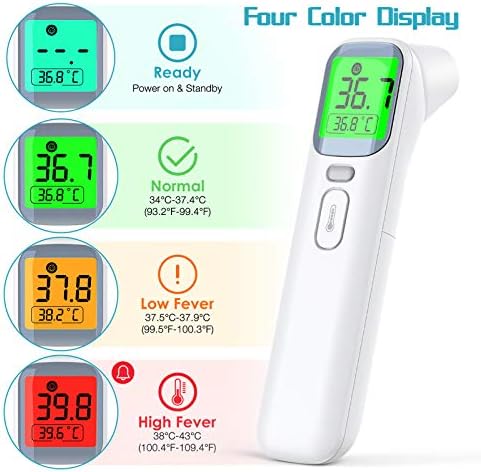 🌡️【4-Color LCD Display】The ultra-clear digital backlit digital display of the ear infrared thermometer allows you to see the reading clearly even without turning on the light at night. In the mannequin, you can judge whether you have a fever by different colors: blue is the standby state, green (32.0-37.5℃), orange (37.6-38.0℃), red (38.1-42.8℃).Small body with large screen, schow current and previous readings, a reliable good companion for the family!