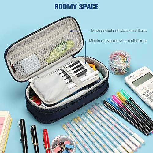 💕 [Large Capacity] The main compartment, can store up to 30-50 pens; zippered mesh pocket can store small stationeries, such as erasers, sticky notes etc; the middle mezzanine with elastic straps to securely hold pens in place.