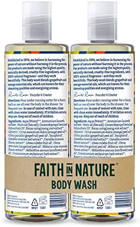 At FAITH IN NATURE, we believe that nature should be accessible for everyone, so have developed a range of banded duo packs for even better value. Our consumers can purchase these sets for themselves or as a gift. Our natural vegan body washes gently cleanse without removing the skin’s natural oils. Just as nature intended. We believe in harnessing the power of nature without harming it in the process. Each body Wash is created with an individual characteristic and benefit provide you the best that nature has to offer. It works up to a rich, thick lather that easily rinses off your skin. They are SLS and paraben free, animal cruelty free and made with essential and organic oils. – who said beauty isn’t skin deep? Our grapefruit & Orange body Wash duo refreshes the body and leaves skin feeling soft by blending zesty grapefruit and organic orange essential oils, which are known for their cleansing qualities and energising aromas. Our invigorating grapefruit and orange body Wash makes a great Shower gel and Bubble bath and is vegan and cruelty-free, perfect for anyone wanting to be as kind to the planet as they are to their skin. Our products work beautifully and are made using naturally derived, high quality, cruelty-free ingredients, with 100% natural Fragrance. How to use: Pour under running water for a foam bath or use all over the body in the shower. For frequent use. In case of contact with eyes, rinse with clean water immediately. If irritation occurs, stop use. Keep out of REACH OF CHILDREN.