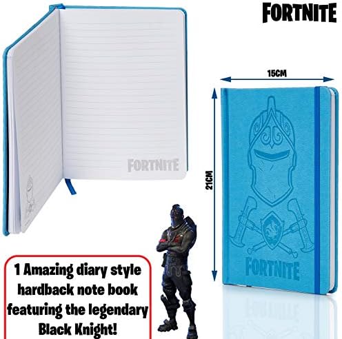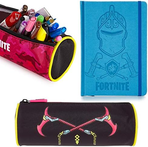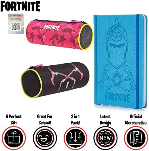 WHAT’S INCLUDED — This fantastic Fortnite bundle for boys and teenagers includes: 1x A5 notebook (Black Knight design in blue) and 1x barrel pencil case with emotes design in black and pink.