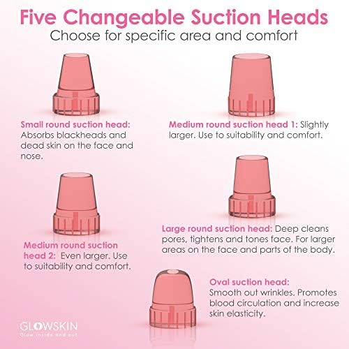 GlowSkin Pore Cleanser Vacuum kit incl. 5 Suction heads, replaceable filters, instructions, USB charger, downloadable eBook.