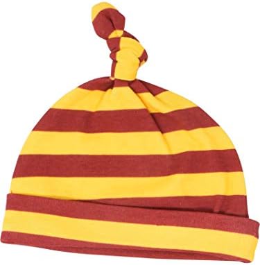 Cozy striped maroon and gold footed pants with rollover waist; matching 2-ply cap with knot