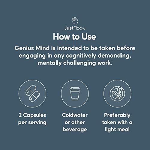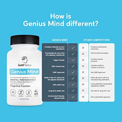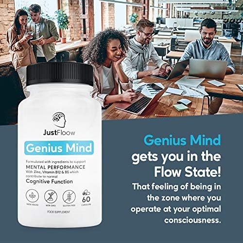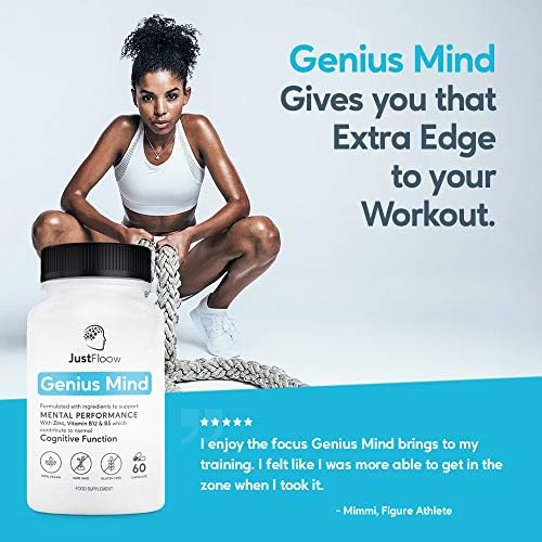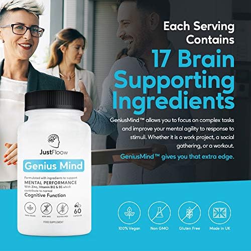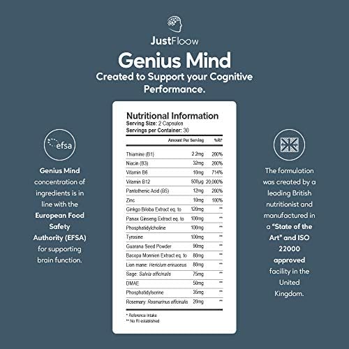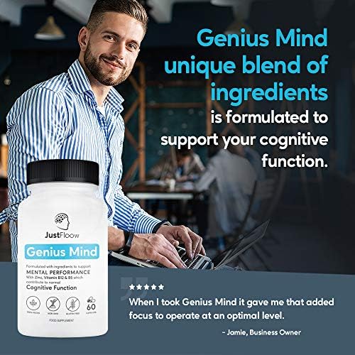 JustFloow Genius Mind | Cognitive Enhancer | 17 Brain Supporting Ingredients Including Ginkgo, Bacopa, Lions Mane, Vitamin B12 | Nootropic That Boost Energy, Focus, Memory and Mental Performance