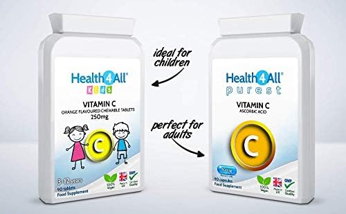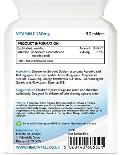 Kids Vitamin C 250mg 90 Tablets (V) Vegan Chewable Vitamin C for Children 3+. Made by Health4All