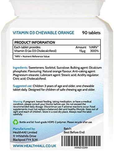 Kids Vitamin D3 600iu Chewable 90 Tablets (V). Sugar Free. Natural Orange Flavour. Made by Health4All Kids
