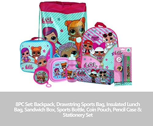 L.O.L Surprise 8PC Back to School Bundle – inc Backpack, Drawstring Sports Bag, Insulated Lunch Bag, Sandwich Box, Water Bottle, Coin Pouch, Pencil Case & Stationery Set.