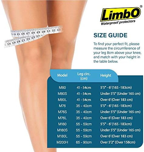 The LimbO Waterproof Protector for lower leg casts or dressings is available in multiple patient sizes. Simply select the model number in the table shown above, using a combination of your height and leg circumference 8cm above your knee. The LimbO will sit at approximately that point on your lower thigh to ensure the perfect waterproof seal. The neoprene seal is designed to stretch over a standard lower leg cast or dressing.