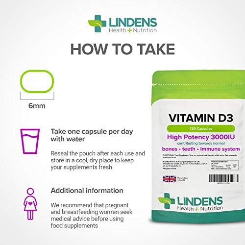Lindens Vitamin D3 High-Potency 3000IU Capsules – 120 Pack – for Bones, Teeth, Immune System – 1500% NRV – UK Manufacturer, Letterbox Friendly