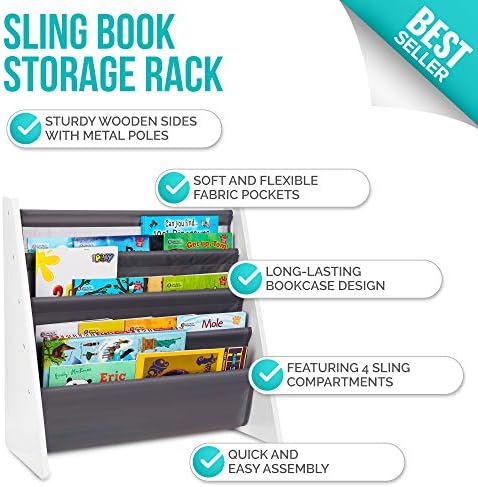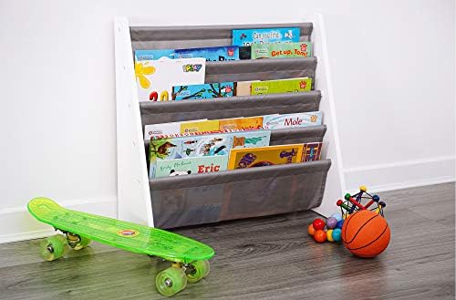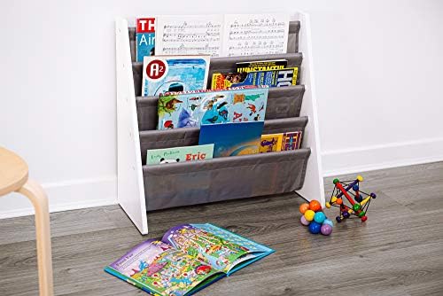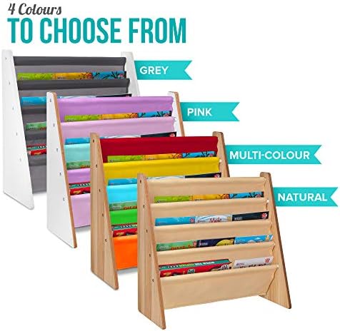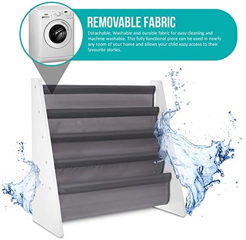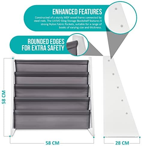 LIVIVO ® Childrens Colourful Sling Storage Bookshelf – Easy Access Wooden Book Storage with Soft Nylon Fabric Shelves to Protect your Kids Books – Perfect Height for your little reader (Grey)