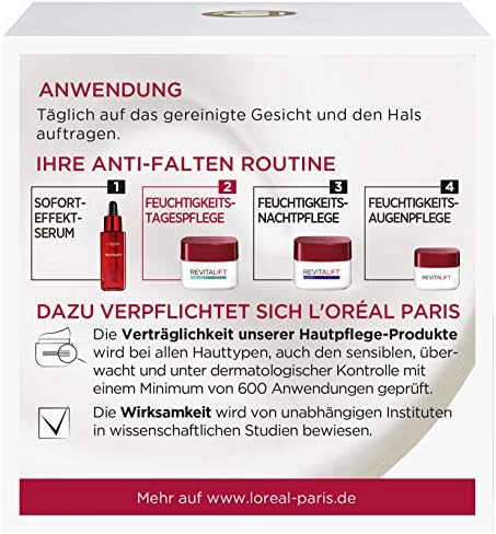 Application: daily application in circular upward movements on the cleansed face and neck, supplementary product: facial cleansing from the L’Oréal Paris Revitalift Classic series