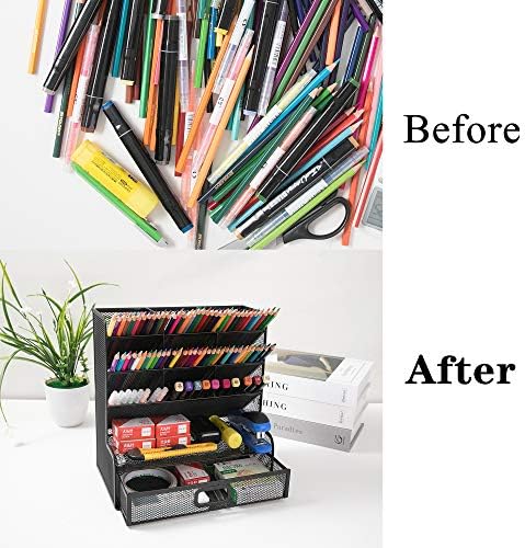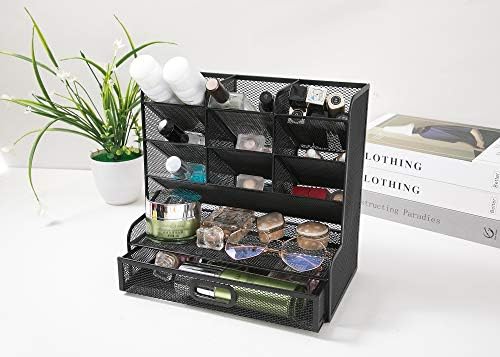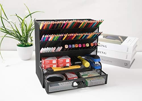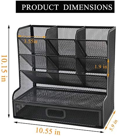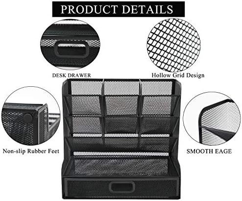 Mesh Desk Organizer Multi-Functional Desktop Stationery Pen Holder Box for Home Office School Supply Storage Rack (Black with Drawer)