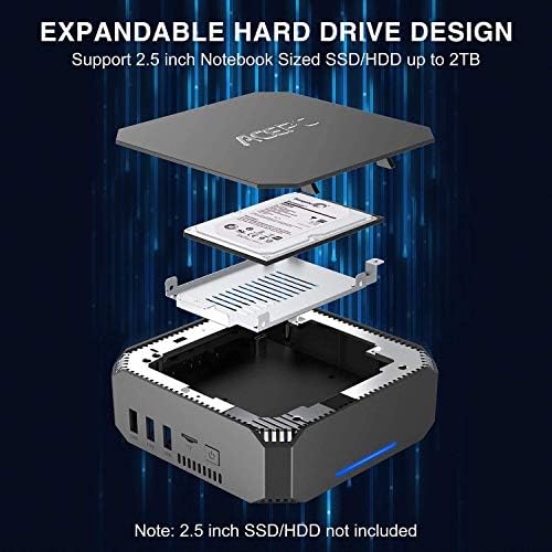 🔵 【 I/O Specifications 】 : AK2 mini desktop pc has 2 x USB 2.0 ports, 2 x USB 3.0 ports, 1 x Ethernet port, 1 Headphone audio out 3.5mm, 1 x Micro SD Card port for storage, 2 x HDMI ports for display and a removal top to add 2.5-Inch SATA HDD or SSD in the storage.