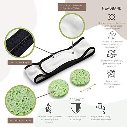 🌿 NATURAL MATERIALS: Our white, cleansing pads are made from 70% bamboo/30% cotton which makes it super soft on your skin. Our black pads are made from 100% bamboo terry, which gives it a slight texture to gently exfoliate and lift dirt and makup off effortlessly. The natural face sponges are made from 100% wood pulp and the headband, from 100% bamboo velvet which is luxuriously soft. Our packaging has been designed to be eco-friendly without compromising on durability and style