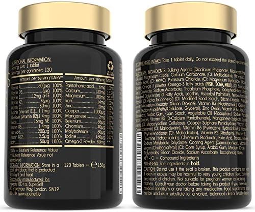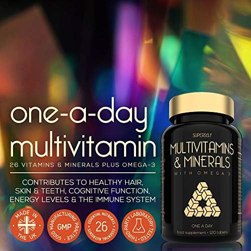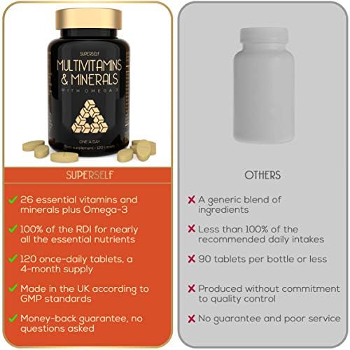 ALL YOUR ESSENTIAL VITAMINS DAILY – These ultimate SuperSelf multivitamin tablets contain the 100% recommended daily dose of all key vitamins, including vitamin A, B complex, C, D, E and K. As well as selected minerals, including iron, magnesium, selenium and zinc, they also contain essential omega 3 fatty acids.