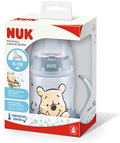 NUK First Choice+ Disney Winnie The Pooh Learning Bottle | 6-18 Months | Temperature Control Indicator | 150ml | Anti-Colic Valve | Leak-Proof Spout | Ergonomic Handles | BPA Free | Blue