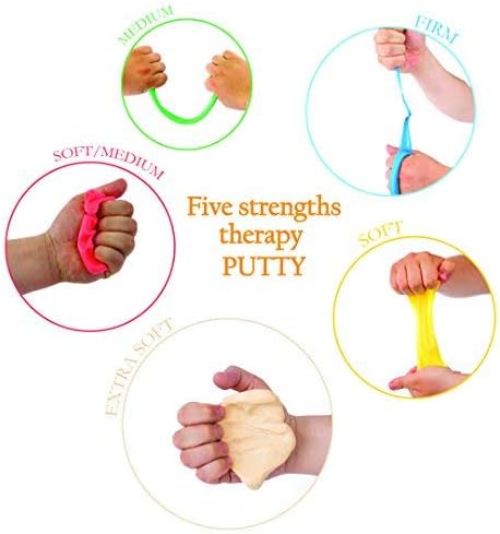 USES: Perfect for rehabilitation, physical or occupational therapy, fidget toy, or stress reliever. Using the therapy putty strengthens the hand muscles, improves fine motor skills and relieves stress. Squeeze, pinch, stretch, and twist the putty to effectively work the hand muscles and to provide a sensory outlet.
