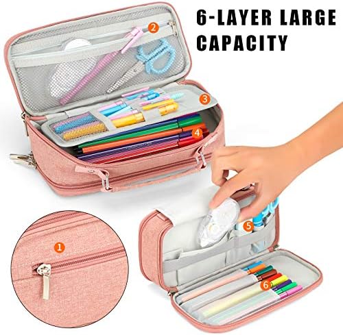 【Big Capacity Bag】4) The large-capacity main compartment is designed with 2 elastic rings and Velcro to fix the pen or calculator to prevent it from falling. 5) The fifth layer is designed with many small pockets, which can hold some small objects, such as rubber, lipstick, etc.The elastic cord outside the pocket and the covering cloth protect the items from falling. 6) The sixth layer is designed with 4 pen holder