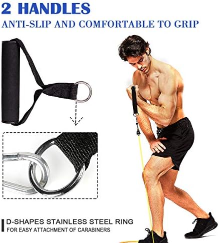 ✔️【Superior Material】The Exercise Resistance Bands is made of superior natural latex material, with great abrasive resistance, high elasticity, high strength, high resilience, non-toxic, safe and durable. High-quality foam hand shank and buckle, fits for the ergonomics design, has good slip resistant, softness and strong grip.