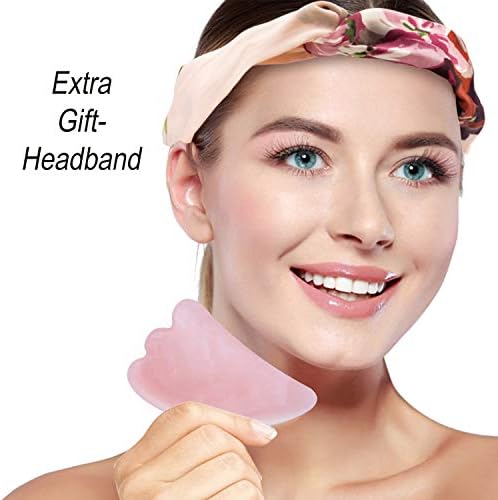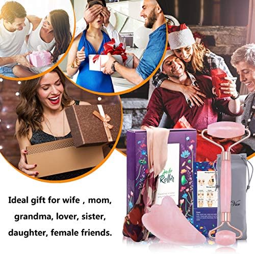Rose Quartz Roller & Gua Sha Massage Tool, 100% Natural Jade Roller, 2 in 1 Anti-aging Crystal Face Roller for Cheeks Slimmer, Skin Tightening, Rejuvenate Skin (Pink)