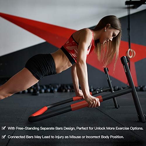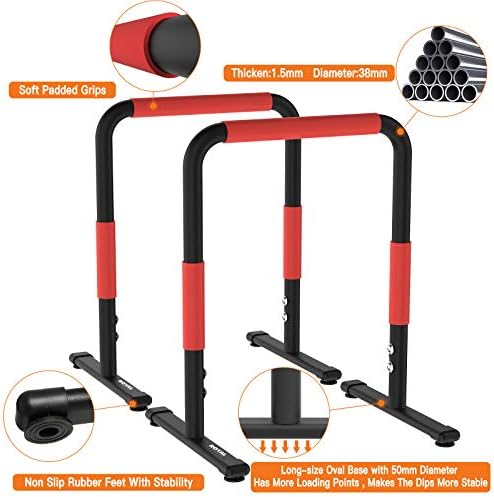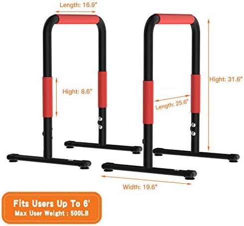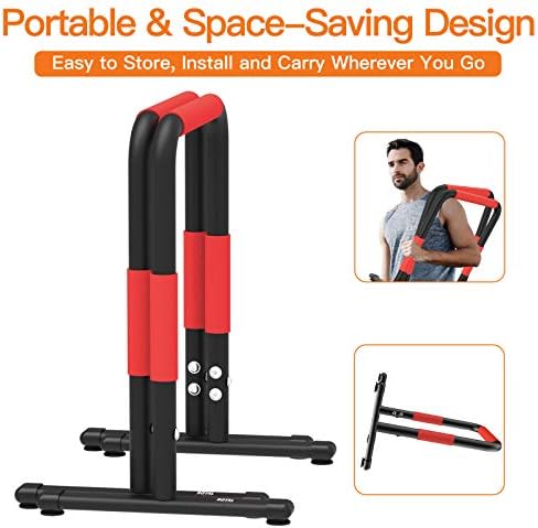 【Lightweight & Portable】The dip bar height is 31.6”, fits users up to 6’, offers exceptional stability in a durable, yet lightweight design. Easy to move around, and take apart for transporting wherever you want to workout, like from the basement to a friend’s house and back again.