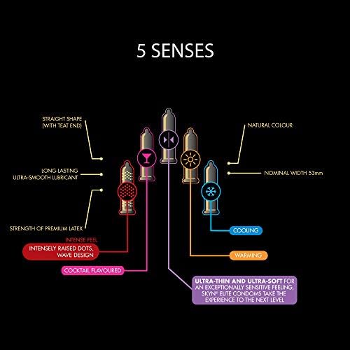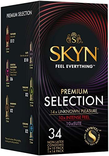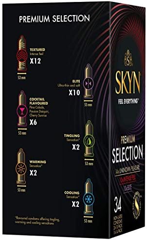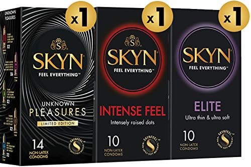 INCLUDED ITEMS – 34 condoms supplied as 1 × 14 SKYN Unknown Pleasure + 1 × 10 SKYN Intense Feel + 1 × 10 SKYN Elite and Free 5 pack of 5 Sense Condom.