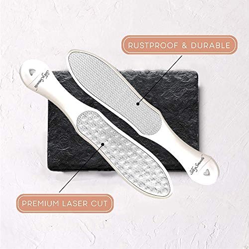 ✔️ PREMIUM QUALITY: SlkySmooth Foot Files are rustproof, waterproof, and made to last. With two surfaces and our brand new integrated mini rasp, you can now foot scrub the most difficult places. Our laser cut, stylish design, and ergonomic handle promise the safest and highest quality foot care tool on the market.