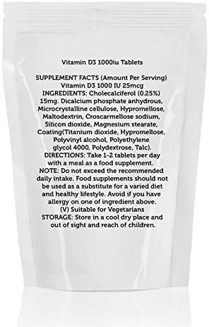 Sunshine Vitamin D3 1000iu 25mcg Tablets Normal blood calcium levels Involved in the process of cell division Healthy bones and teeth. Supports the immune system and muscle function. Active Ingredients Input (mg/tablet) RDAs% Label Claim per Tablet Cholecalciferol (0.25%) 15.000 500 Vitamin D3 25 mcg Inactive Ingredients(mg/tablet) Dicalcium phosphate anhydrous, Microcrystalline cellulose, Hypromellose, Maltodextrin, Croscarmellose sodium, Silicon dioxide, Magnesium stearate, Coating(Titanium dioxide, Hypromellose, Polyvinyl alcohol, Polyethylene glycol 4000, Polydextrose, Talc). Tooling size 6mm (Round shaped) Total weight (mg/tablet) 155.0 Directions: Take one tablet daily. Do not exceed stated dose.