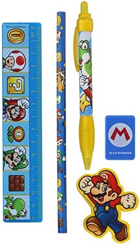 Super Mario Stationery Set includes a wooden pencil, ballpoint pen, pencil sharpener, eraser and ruler.