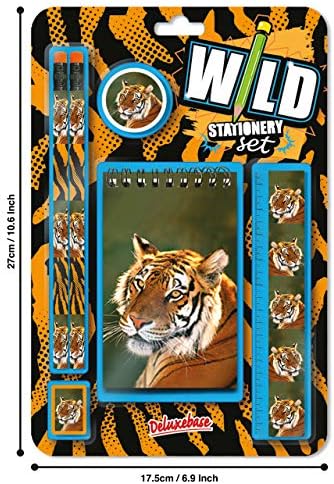 Wild Stationery Set – Tiger from Deluxebase. These Cool School Stationary Sets for Boys Include 2 Pencils, Eraser, Sharpener, Ruler and Notebook